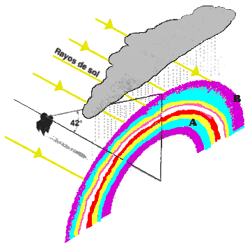 El arco iris se forma cuando las gotas de agua del aire dividen la luz del sol en colores y la reflejan. Para ver un arco iris debes de tener la espalda al sol y debe estar lloviendo en otra parte del cielo. ¿QUÉ ES EL ESPECTRO?La luz blanca está compuesta por luz de distintos colores. Un prisma dobla la luz de distintos colores (longitudes de onda) en distintos ángulos, creando las bandas de colores denominadas espectro. ![]() GEOMETRÍA DEL ARCO IRISEl número mágico es el 42 grados. Imagina que un arco iris es un círculo. Primero traza una línea desde el sol, a través del observador, hacia el centro del arco iris. La línea desde el observador hasta la parte superior del arco iris, crea un ángulo de 42 grados. ![]() CUANDO SE FORMAN DOS ARCO IRISA PRIMARIO (FUERTE): Rojo fuera, violeta dentro. B SECUNDARIO (FLOJO):La luz se refleja dos veces en las gotas de lluvia, invirtiendo los colores. Rojo dentro, violeta fuera. |